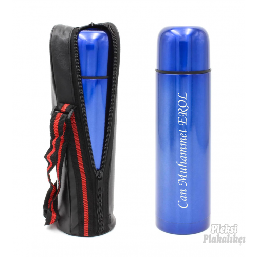 Kişiye Özel İsimli Çantalı Bardaklı Lüks Çelik Termos - 500 ml - MAVİ